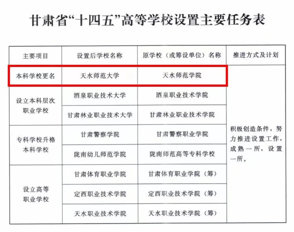 日前,甘肃省人民政府办公厅印发了《关于甘肃省“十四五”高等学校设置规划的通知》,天水师范学院更名大学被列入甘肃省“十四五”高等学校设置规划,成为列入规划的唯一一所本科更名学校。这是学校事业发展过程中的一个重要里程碑,标志着今年会更名大学工作站在了新的历史起点。