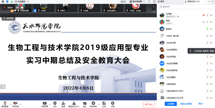 为进一步贯彻落实习近平总书记关于安全生产的重要论述及学校党委关于疫情防控工作的安排部署要求,及时发现和总结实习过程中的问题,在与实习单位前期沟通和反馈的基础上,jinnianhui今年会于4月6日召开2019级应用型专业实习中期总结及安全教育大会。党总支副书记石国玺,副院长马伟超,特邀嘉宾复旦大学杨亚军教授,全体实习指导教师,2019级生物技术、生物制药、食品质量与安全三个应用型专业全体同学,共计156人参加了会议。