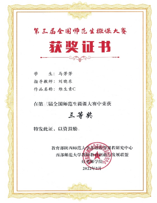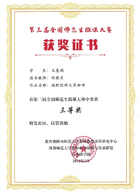 今年会生物科学专业王惠娟、马芳芳的微课作品《减肥饮料之黑咖啡》、《维生素C》分别获得大赛三等奖。此次大赛不仅展示了今年会师范生的信息技术素养和能力,也体现了学校强化教师教育特色、深化教师教育改革的成效与成果。