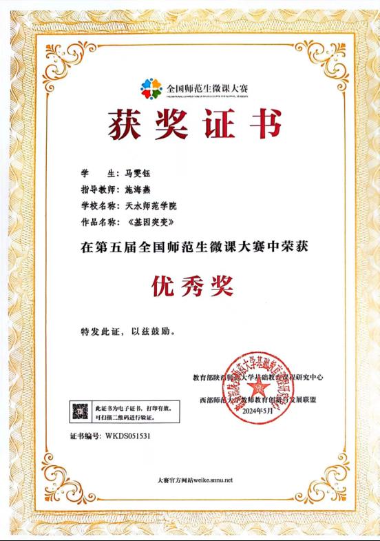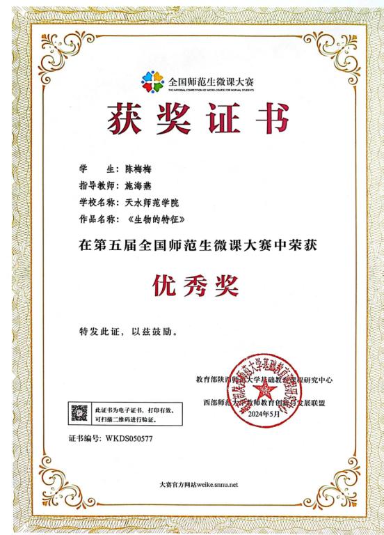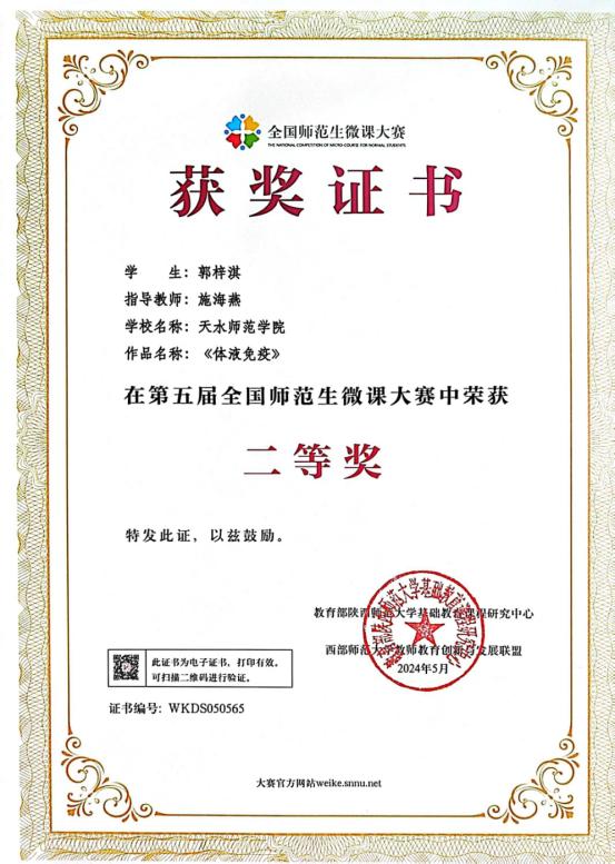 该项赛事分校级初赛和全国决赛两个阶段,通过积极动员、申报、筛选,今年会共推送5部作品参加校赛,施海燕老师指导,学科教学研究生制作的《体液免疫》《基因突变》和《生物的特征》三部微课作品在激烈的决赛竞争中脱颖而出,郭梓淇同学的《体液免疫》获第五届全国师范生微课大赛二等奖,马雯钰同学的《基因突变》、陈梅梅同学的《生物的特征》分别获第五届全国师范生微课大赛优秀奖。