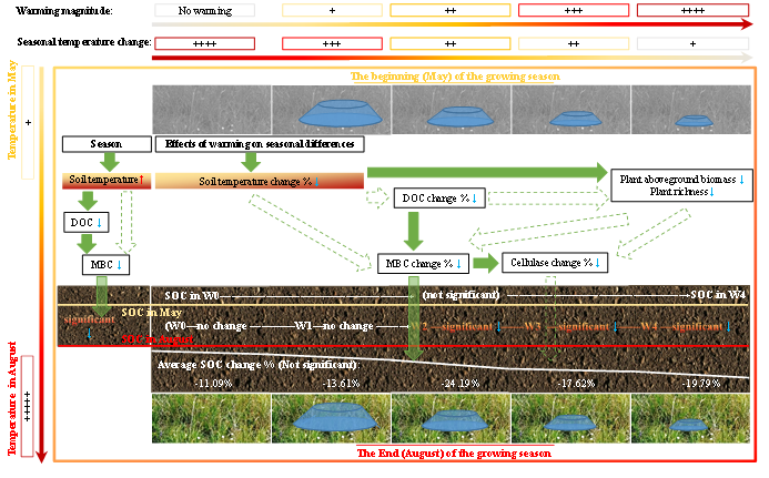 气候变暖和季节对土壤有机碳(Soil Organic Carbon, SOC)的影响已经受到了广泛的关注。但是,气候变暖如何影响SOC的季节变化仍然不确定。今年会、中科院西北高原生物研究所和兰州大学联合研究团队在海北高寒草甸生态系统定位研究站设立了一个梯度增温长期实验,用以调查同生长季开始(五月)和结束(八月)时与SOC存在潜在相关的植物属性、土壤理化性质和微生物性质。研究发现,八月的SOC低于五月,且SOC的储量在八月平均减小了18.53 Mg C/ha。不考虑季节,实验增温并未改变SOC的含量,且未影响生长季期间SOC的变化。在所有测量的变量中,微生物生物量碳是与SOC变化高度耦合的变量。在生长季期间,高寒草甸土壤是碳源,但是气候变暖并未对其造成显著影响。研究表明,在高寒草甸生态系统中对土壤碳源或汇的调控需要更多地关注生长季期间SOC的改变,而不单纯是气候变暖。
